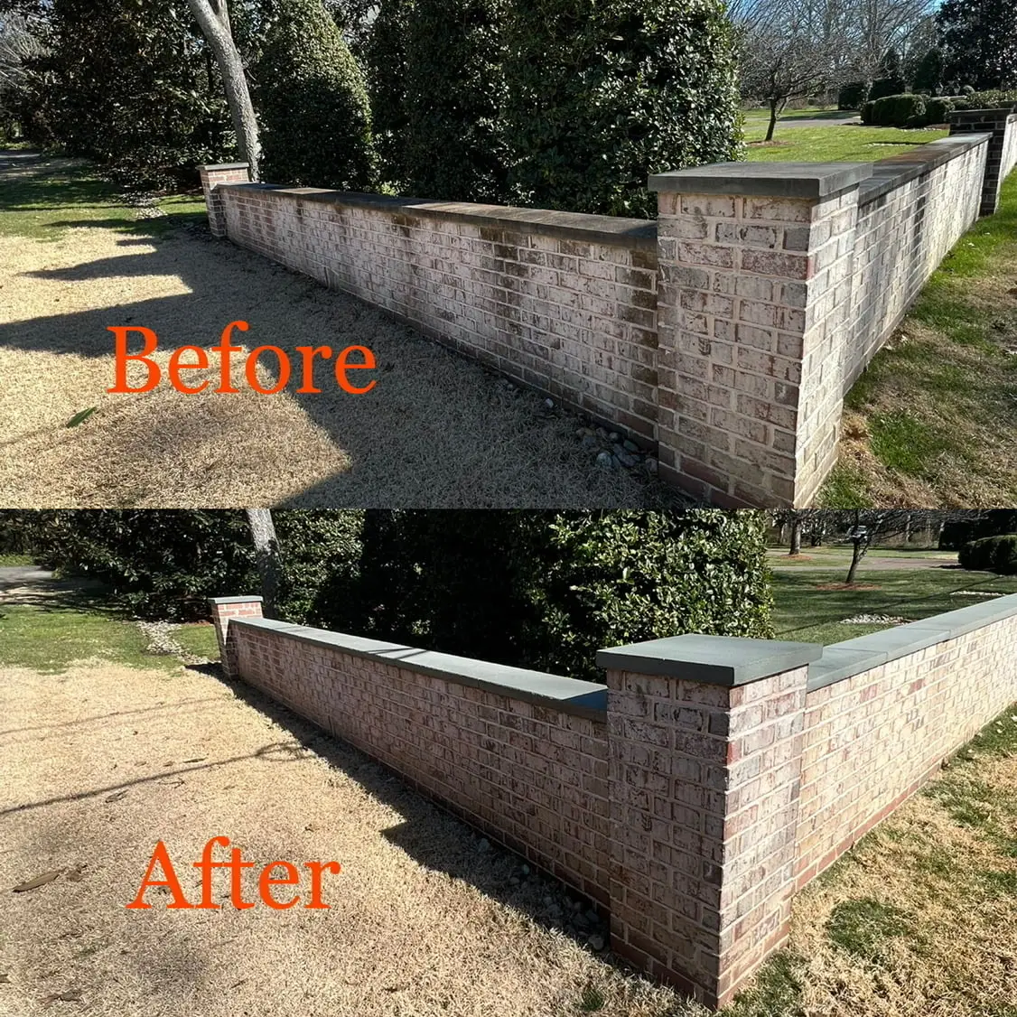 Sodium hypochlorite is used on non-wood surfaces when appropriate, while wood surfaces are cleaned exclusively with a sodium metasilicate–based cleaner. All products are applied in carefully controlled strengths based on the material being cleaned. Safety comes from the process; plants are pre-wetted, solutions are never over-concentrated, and all surfaces are thoroughly rinsed immediately after application. This approach effectively removes organic growth while minimizing risk to surrounding areas and materials.